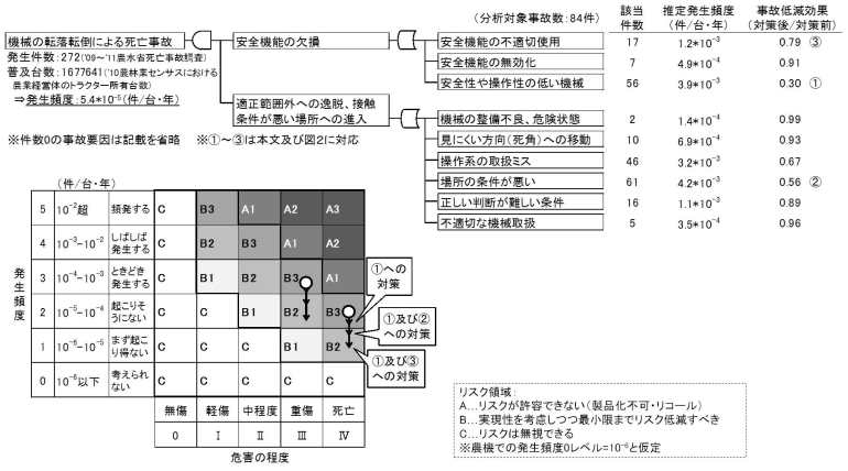図 乗用トラクターの転倒転落死亡事故の分析結果(上:故障の木解析、下:R-Map)