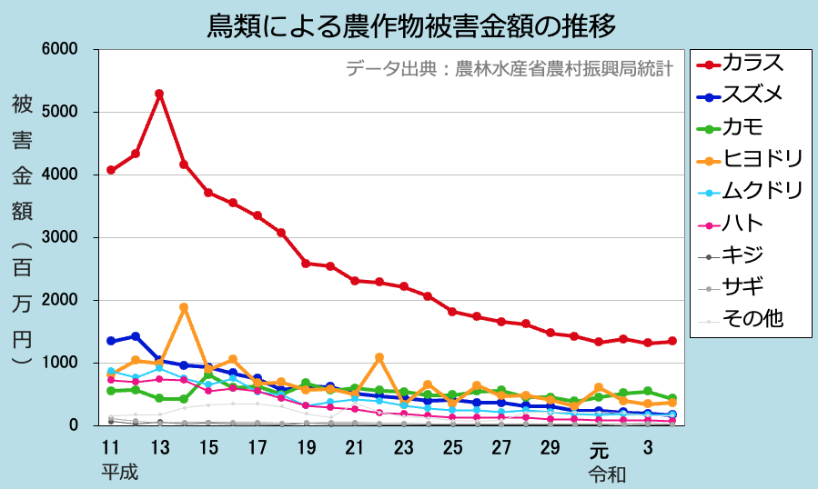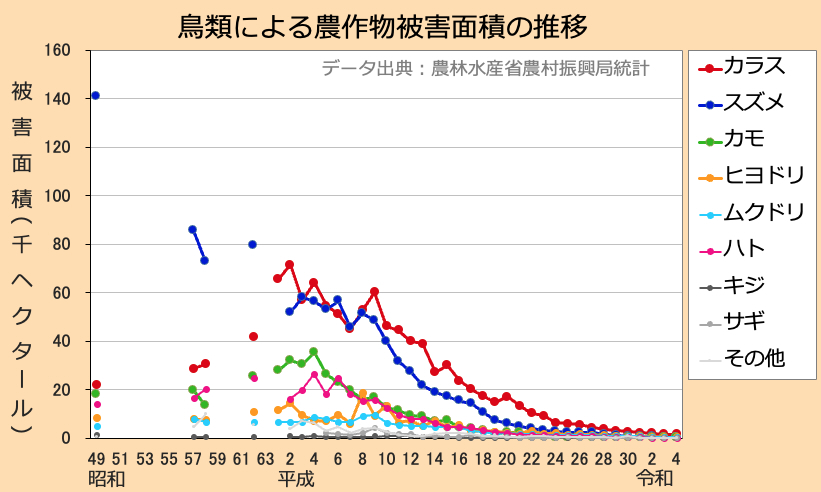 鳥は広域で移動するので、農家単位での被害対策(追い払い)と広域での被害軽減は両立しにくいものです。地域としてはたいした被害ではなくても、特定の農家が甚大な被害を被ることがあります。いたずらに防鳥機器にコストをかけるよりも、被害が集中したところに補償した方が安上がり、という発想も必要でしょう。ガン類やツル類といった大型の保護鳥渡来地では自治体が独自の補償制度を設ける例も出てきています。