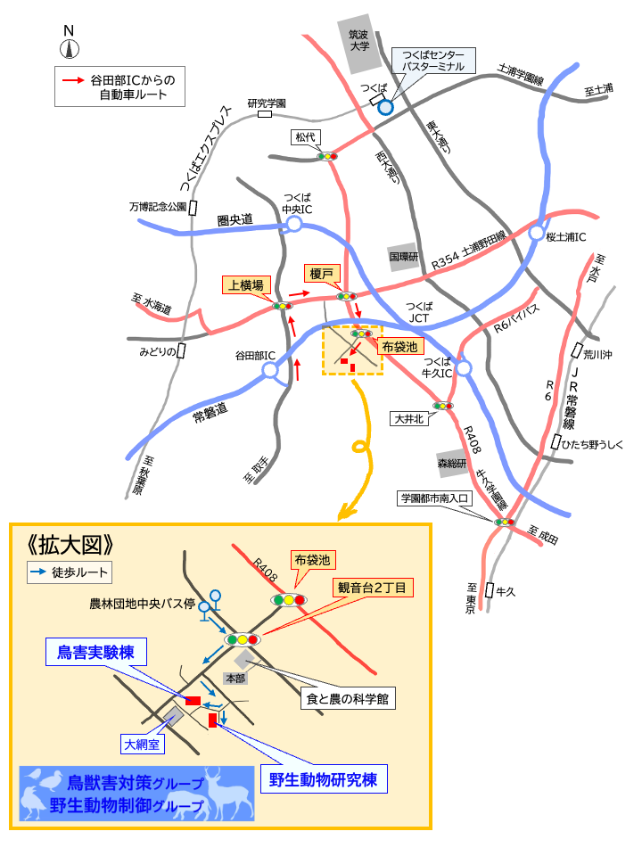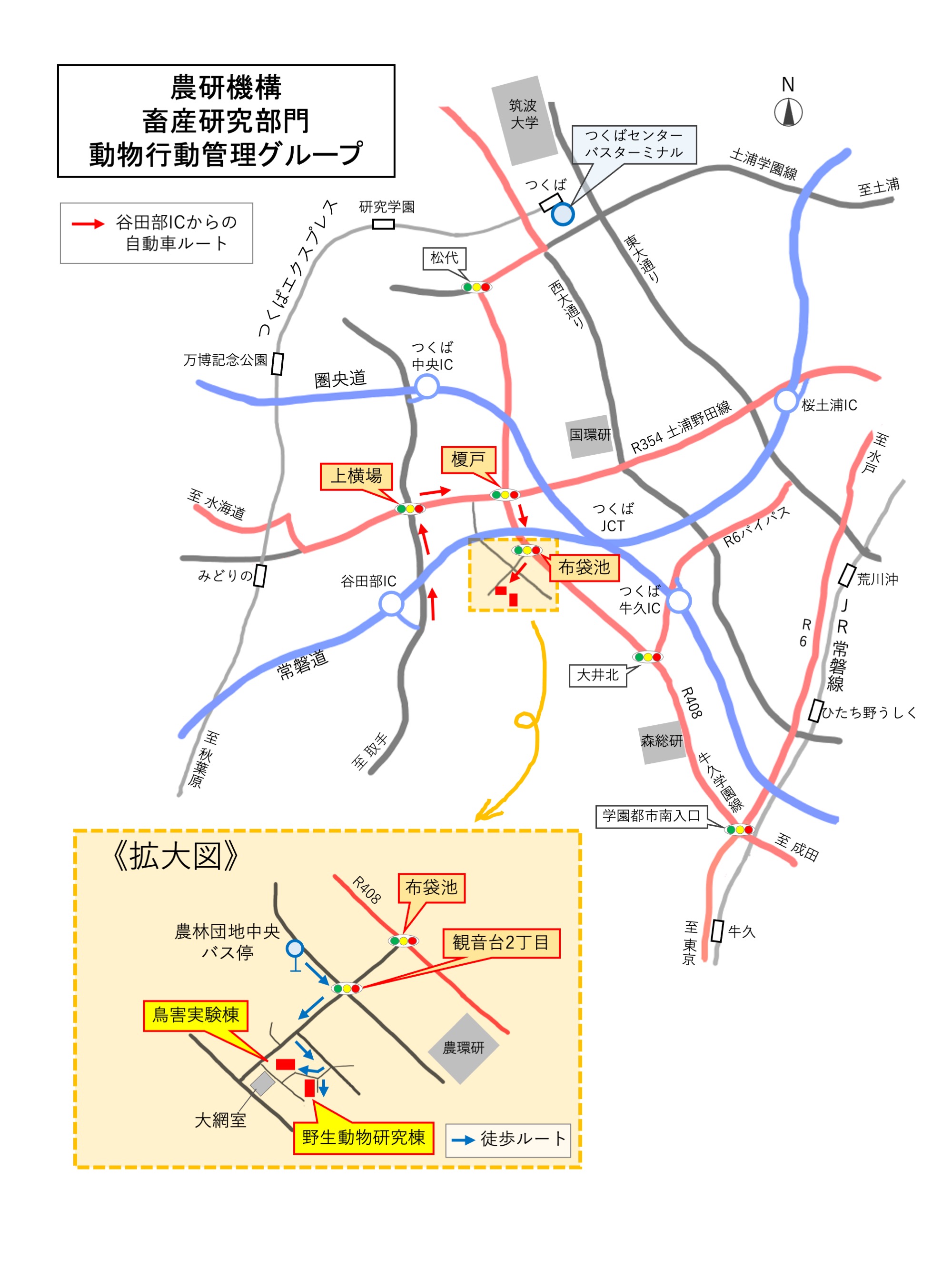 | 鉄道(JR) | ❖常磐線 牛久駅下車(東京駅より約1時間) →牛久駅西口より 関東鉄道バス「谷田部車庫/生物研大わしキャンパス行き」に乗車 →「農林団地中央」下車(約20分)、徒歩10分 |