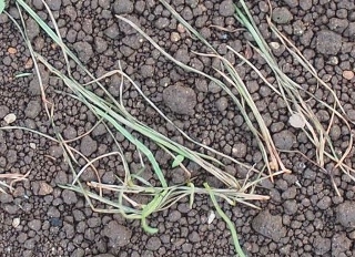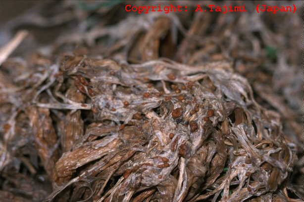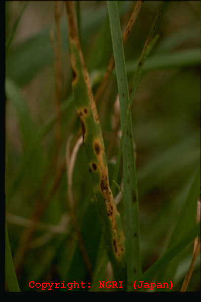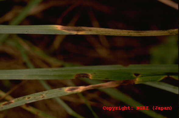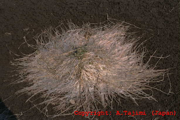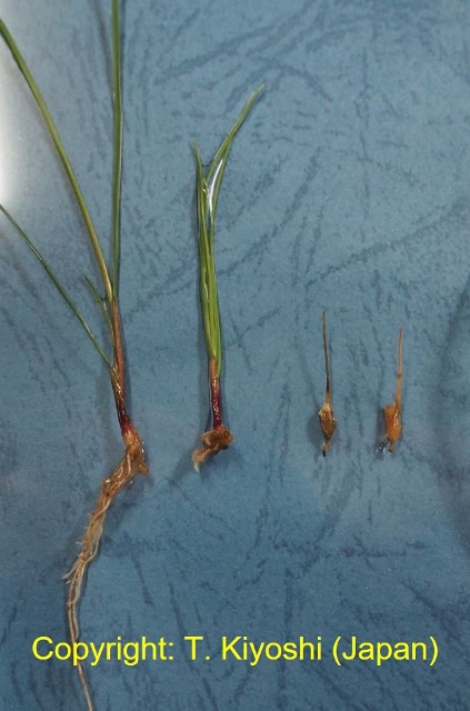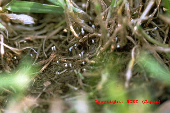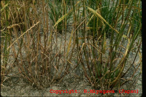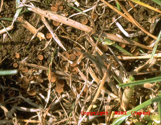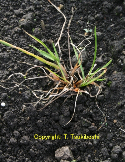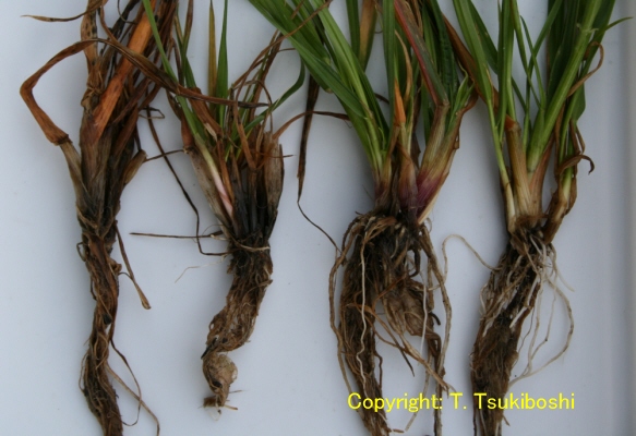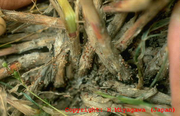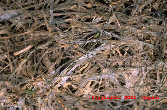 葉、葉鞘、稈および冠根など地上部全体に発生する糸状菌病。初め地面に近い葉や葉鞘が暗色水浸状になり、表面を白い絹糸状の菌糸がはう。後に栗褐色、直径0.3-0.5mmの菌核が形成され、植物体は地際部から腐敗するように枯れていく。 |