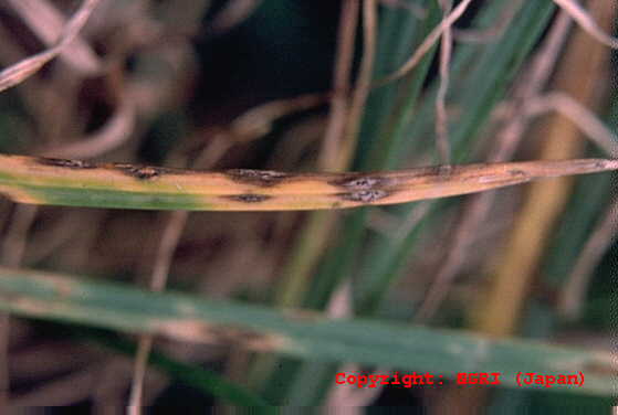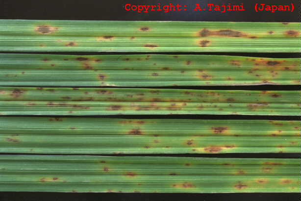 夏に多く発生する斑点性の糸状菌病。病斑は葉身に形成され、褐色、楕円形から不整形で、中央部は黒褐色となる。大きさは5ー6×2ー3mm程度で、多発すると葉を枯らす。周縁部はやや黄化する。病原菌はヘルミントスポリウム菌で、寄主範囲が広く、フェスク斑点病なども引き起こす。