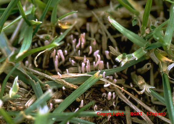 積雪下で株枯れを引き起こし、関東以北に分布する糸状菌病。積雪下の茎葉が軟化・枯死し、ピンク色に見える。菌核は形成しない。非積雪地域の芝地でも、発生が報告されている。病原菌はマイコトキシンとして、ニバレノールおよびデオキシニバレノールを産生するとされてきたが、最近の研究で少なくとも日本産の菌は産生しないことが分かっている。 |