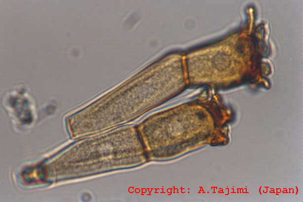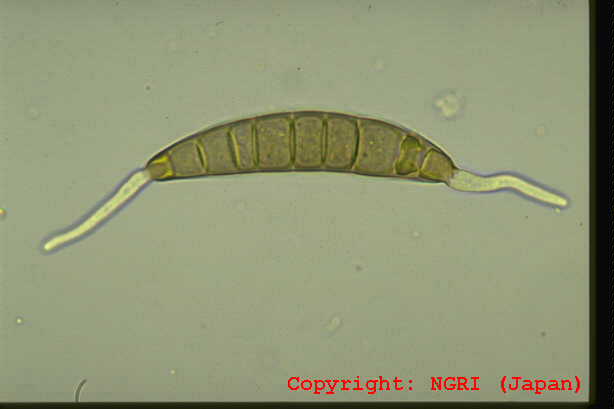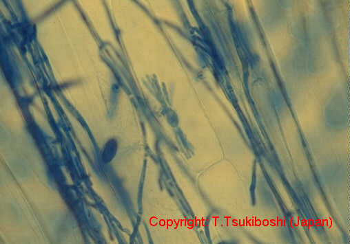 イネ科植物の内生菌(エンドファイト)であるため、一般的に無病徴で、感染した植物は非感染植物と区別がつかない。葉身や葉鞘などで、無色で分枝が少なく捻れた菌糸が植物細胞間隙を進展する。種子内にも侵入し、菌糸がデンプン粒間を進展して、次世代への感染源となる。わが国では1990年代からライグラスのエコタイプ等で確認されている。感染した植物は、耐虫性、耐病性および環境ストレス耐性などを獲得する。 |