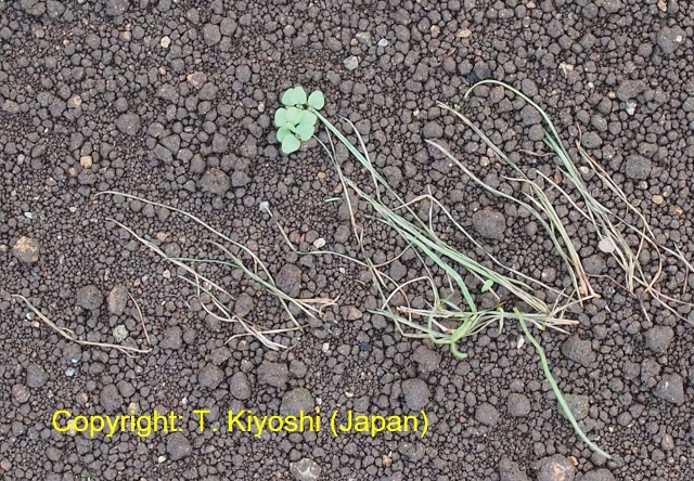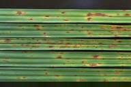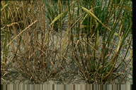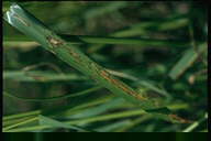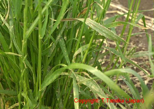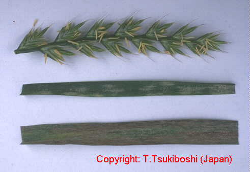 1996年に宮崎県でイタリアンライグラスに発生した病害。4月から7月にかけて、葉身および葉鞘に発生し、初め表面に白色粉状の楕円形の菌叢を形成し、後に拡大して灰白色の菌叢となる。発生後期には病斑は相互に融合して不定形となり、植物体全体にうどんこを振りかけたような状態になる。病原菌はライグラス類に特異的な病原性を示す。 |