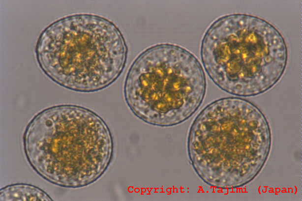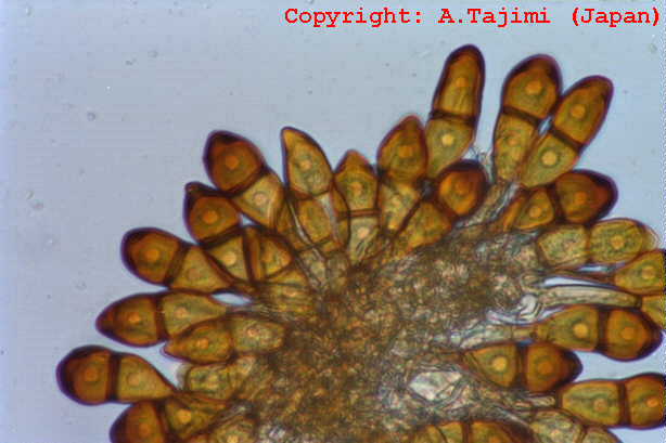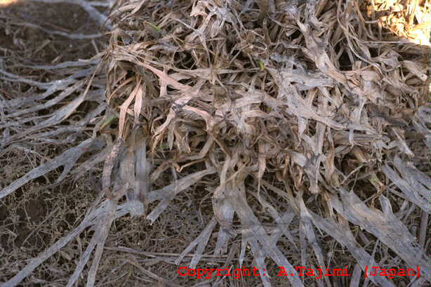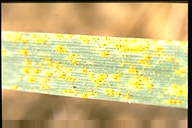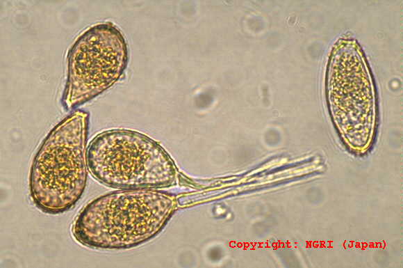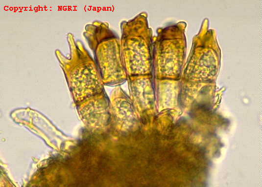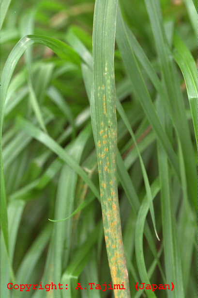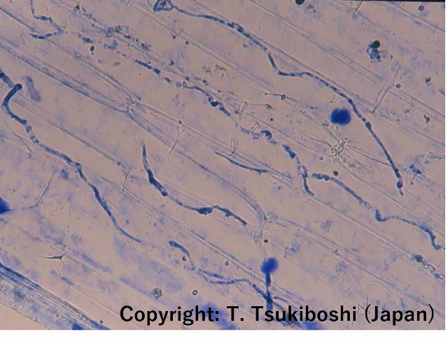 イネ科植物の内生菌(エンドファイト)であるため、一般的に無病徴で、感染した植物は非感染植物と区別がつかない。葉身や葉鞘などで、無色で分枝が少なく捻れた菌糸が植物細胞間隙を進展する。種子内にも侵入し、菌糸がデンプン粒間を進展して、次世代への感染源となる。わが国では1990年代からトールフェスクのエコタイプ等で確認されている。感染した植物は、耐虫性、耐病性および環境ストレス耐性などを獲得する。 |