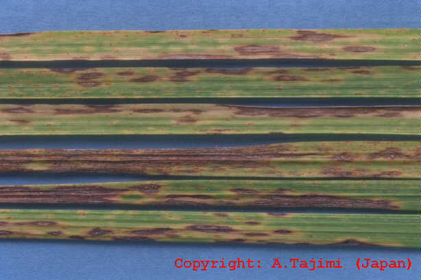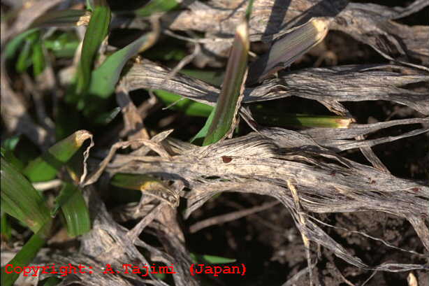 積雪下で株枯れを引き起こし、関東以北に分布する糸状菌病。積雪下の茎葉が軟化・枯死し、ピンク色に見える。菌核は形成しない。非積雪地域の芝地でも、発生が報告されている。病原菌はマイコトキシンとして、ニバレノールおよびデオキシニバレノールを産生するとされてきたが、最近の研究で少なくとも日本産の菌は産生しないことが分かっている。 |