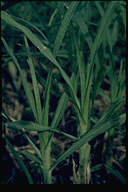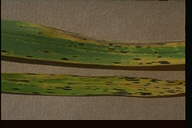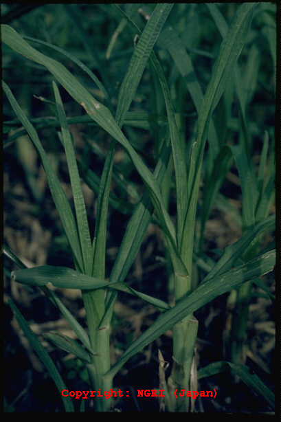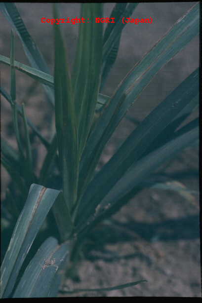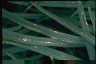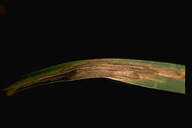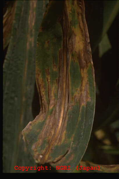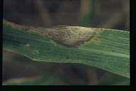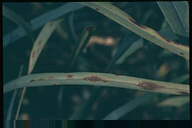 葉に斑点を形成する糸状菌病。病斑は初め褐色、楕円形~紡錘形の斑点であるが、後に拡大し、葉脈に沿って長く伸びて、長さ20-30cmに達してすじ状になる。病斑表面にはかびを密生してすす状を呈する。病原菌はオヒシバ葉枯病菌と同一。 |