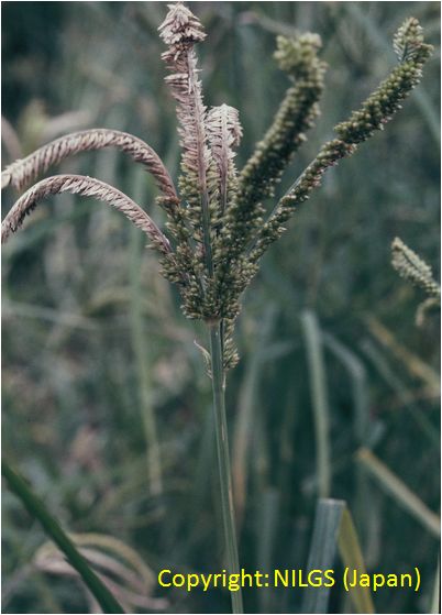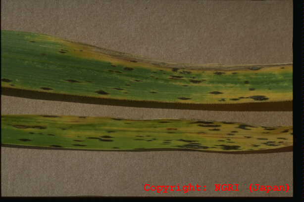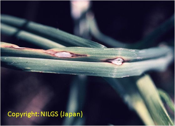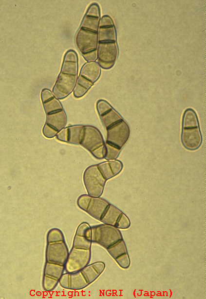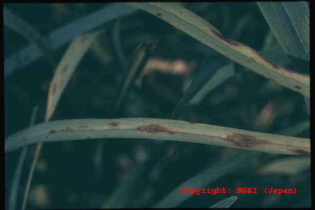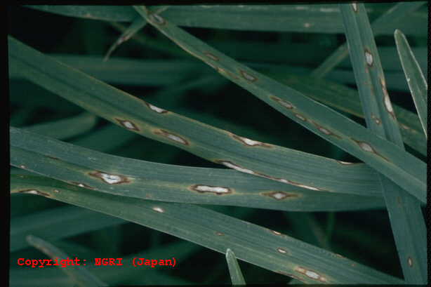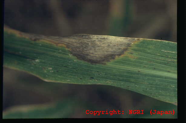 暖地で発生が多い斑点性の糸状菌病。病斑は短い紡錘形で、灰白色、周縁部は褐色となることが多い。大きさは長さ2-5mm程度であるが、激発すると病斑が融合し、葉全体を枯らす。病原菌はイネいもち病菌と同種であり、培地上ではよく交配する。ライグラス菌と近縁だが、寄生性は分化しており、相互に感染しない。フィアロ型の小生子を形成することがある。 |