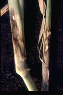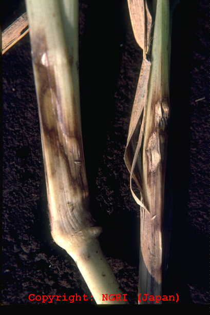 梅雨入り前から地際部で発病し、病斑が葉鞘を伝って上部へ進展する。病斑は周縁部褐色、中心部灰白色の雲形斑となる。発生後期には病斑上に褐色で表面が滑らかな菌核をつくり、これが地面に落ちて翌年の感染源となる。高温(特に30℃以上)高湿条件で多発する。病原菌は牧草葉腐病、イネ・ソルガム紋枯病などと共通している。 |
