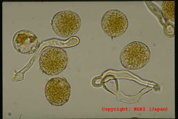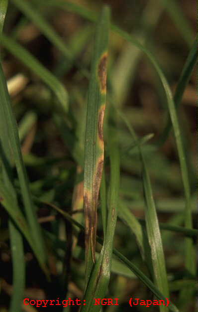 発生すると出穂を阻害し、採種栽培で問題となる糸状菌病。春の終わりに止葉周辺の葉鞘を巻くようにして、がまの穂状に長さ1ー3cmの白色菌叢が形成される。この表面には多数の分生子が形成される。 |