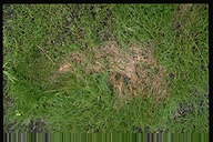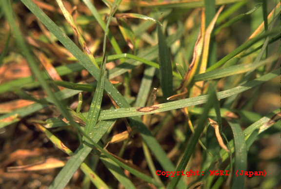 うどんこ病は、日本では芝草類としてはブルーグラスにのみ発生する。病斑は初め葉身上の白い絹糸状菌叢であるが、すぐに拡大して相互に融合する。病斑はこのとき灰色に変わり、表面は粉状となる。寡照多湿条件で多発する。ターフとしては、広い範囲で白く薄汚れたような状態となる。病原菌は他のイネ科植物のものとは、寄生性が異なる。 |