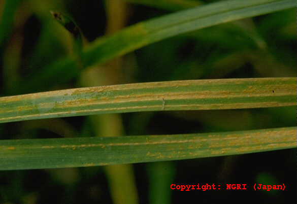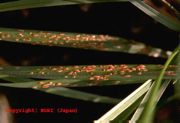 ブルーグラスのさび病の中では、最も被害が大きい。葉の表に円形から長楕円形の夏胞子堆を形成し、表皮が破れて橙黄色の粉を飛散する。やがて夏胞子堆は葉表面に密生し、激発すると植物体全体が黄色く見える。冬胞子堆は黒色、長楕円形から線形、長く表皮に被われ、やや隆起する。 |