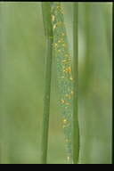 さび病の一種。葉、葉鞘および稈の表面に橙黄色、楕円形、長さ1mm程度の腫れ物状の病斑が縦に連なるようにできる。病斑は成熟すると表面が破れて夏胞子を飛散させる。冬胞子堆は葉では裏に生じることが多く、灰黄色、あまり隆起しない。病原菌はチモシーにも寄生する。 |