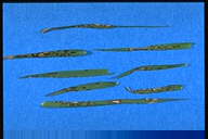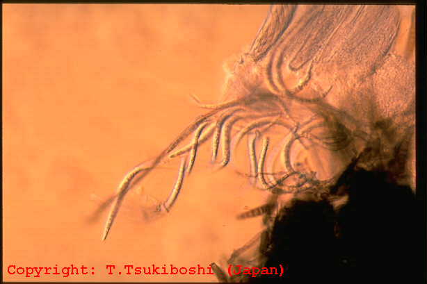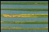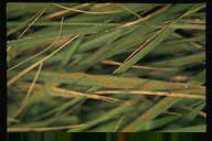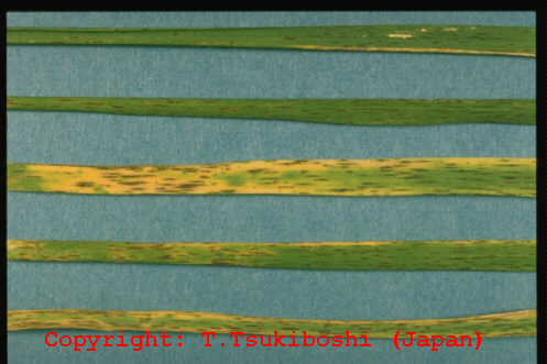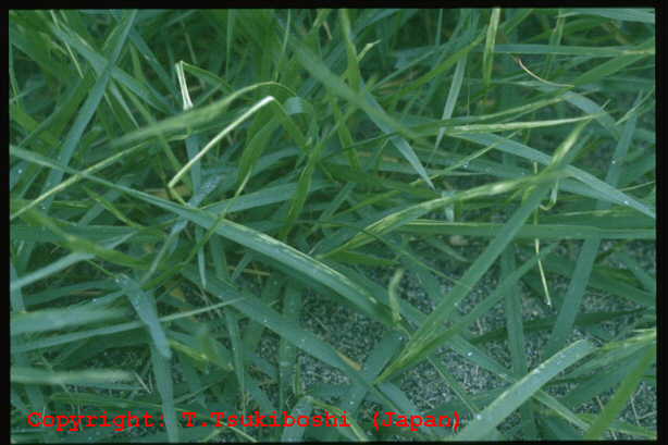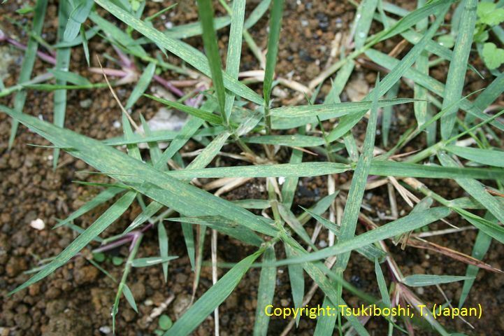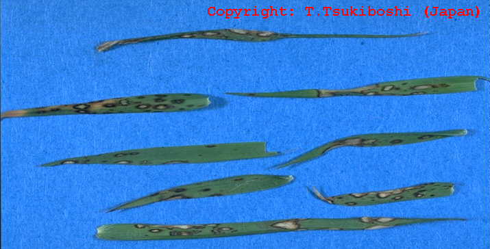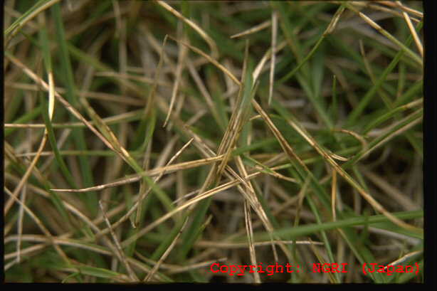1999年7月栃木県内で発生。葉身に中央部灰色、周縁部褐色となる紡錘形の病斑を生じ、葉身先端部が侵され易い。古い病斑上に多数の黒点(分生子層)を生じる。