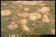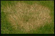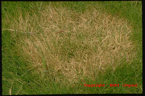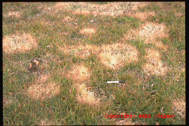 日本シバで最も被害の大きい糸状菌病。初めは春先にぼんやりと枯れる程度だが、気温の上昇と共に病斑が一気に出現する。病斑は灰白色、不定形で、直径は2-3mにも達する。手当が遅れると再生不能になり、パッチが夏まで残る。病原菌はリゾクトニアだが、ある種の病原性の強いピシウム菌との混合感染によって、病勢が大幅に強まることがわかっている。 |