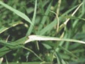 暖地での発生が多い株枯性の病害。初め灰緑色、水浸状に葉が変色し、やがて熱湯をかけたように軟化していく。葉には大型の病斑が形成される。発病した草地はつぼ状に枯れ、徐々に裸地化が進む。病原菌は未同定である。 |