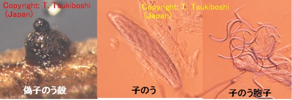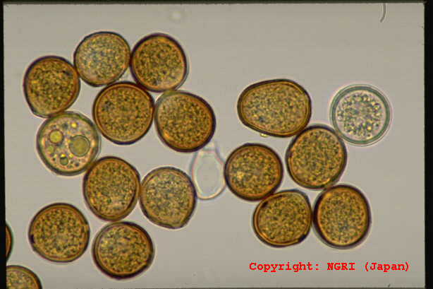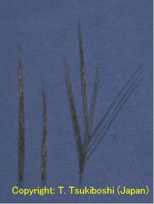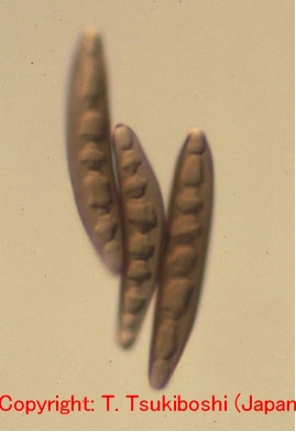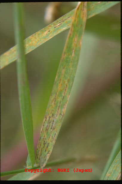 2003年10月に鳥取市で発生した新病害。葉に斑点を形成する糸状菌病。病徴は葉身および葉鞘に、楕円形から紡錘形、褐色~紫褐色、大きさ2-8×1-2mm程度の病斑を形成する。多発すると株全体が枯れ上がる。 |