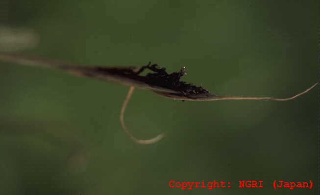 暖地で発生の多い穂枯性の糸状菌病。出穂後、穂が灰色から黒色の菌叢に覆われ、枝梗が互いに接着された状態となり、穂全体がかびる。葉には白色の菌叢が葉脈に沿って条状に現れる。病原菌はエピファイトとして植物表面に感染し、感染植物は耐虫性を持つようになることが報告されている。 |