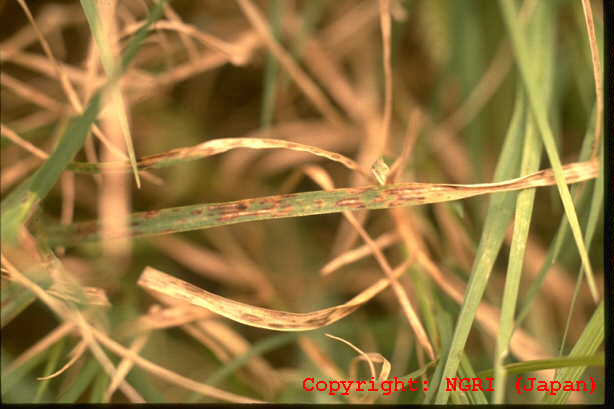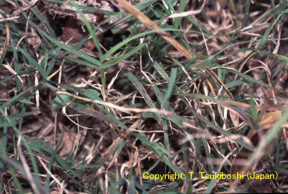 2002年春および秋に沖縄県石垣市の芝地で発生した新病害。葉に斑点を形成する糸状菌病。病徴は葉身に暗褐色、大きさ2-5×0.5-1mm程度の条斑を形成する。多発すると葉は黄化・枯死する。ノシバ褐条葉枯病菌と同種。 |