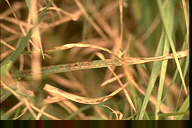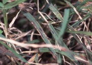 葉に斑点を形成するバミューダグラスの代表的な葉枯性病害。病徴は葉身および葉鞘に、楕円形~不整形、灰緑褐色~褐色、周縁部濃褐色で、大きさ3-5×1-2mm程度の病斑を形成する。多発すると葉が淡褐色~わら色となり、葉全体が白く枯れたように見える。芝地ではパッチ症状となる。 |
