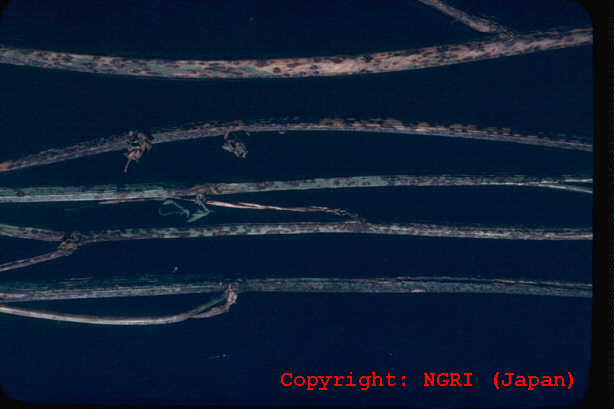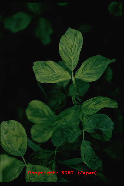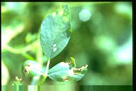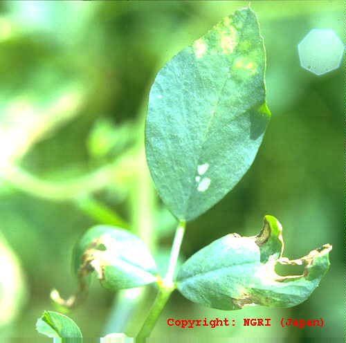 主に葉に発生する斑点性の細菌病。初め水浸状の微細な円形斑点だが、後に内部淡褐色、周縁部暗褐色、直径2-3mmの病斑になる。病斑周囲には黄色のハローを形成し、被害葉は奇形になる。 |