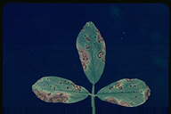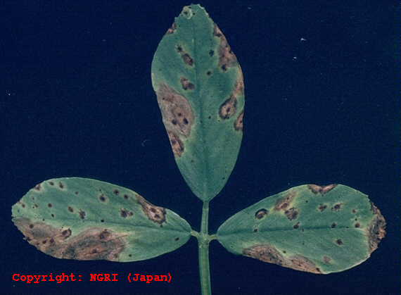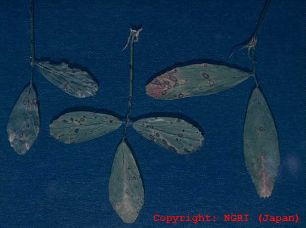 葉に多く発生する斑点性の糸状菌病。葉では初め内部は灰褐色、周縁は濃い褐色の小斑を形成する。やがて病斑の周縁は淡褐色に変わり、不鮮明な褐色輪紋をもつ3~5mm程度の円形病斑に拡大する。病斑はしばしば葉縁から伸長して隣接病斑と融合して大型病斑となり、葉は縮んで枯れる。病葉は早期に落葉する。病原菌はアカクローバ葉枯病菌と同種だが、アカクローバにはほとんど寄生性を示さない。 |