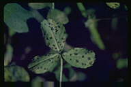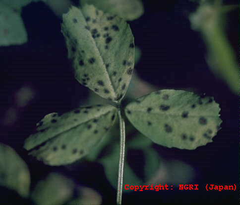 冷涼多湿な時期に多く発生する斑点性の糸状菌病。葉、葉柄、茎を侵す。葉にはじめ針頭大、茶褐色の斑点を生じ、1-2mmの円形斑点となる。後に病斑中央部に濃褐色のいぼ状の子のう殻が生じ、多湿時にはこの部分がゼリー状を呈する。病斑が多いと、葉は黄褐色となり、落葉しやすくなる。病原菌はクローバいぼ斑点病菌とは別種である。 |