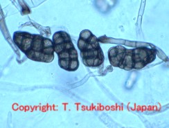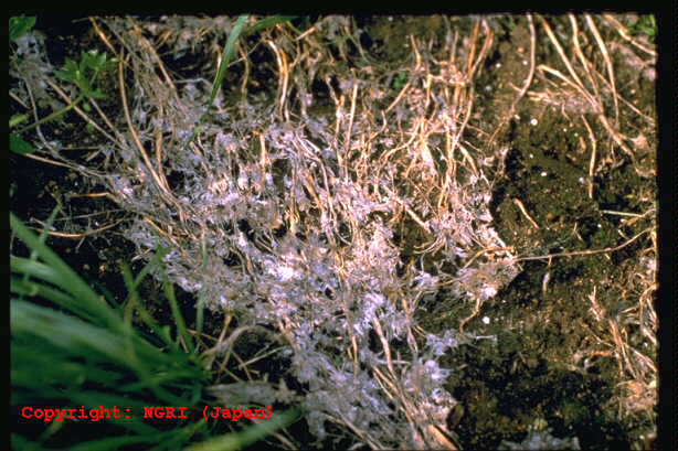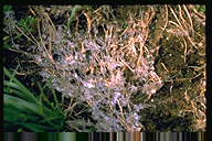 地上部全体に発病する糸状菌病。よく繁茂した株の地際から発病し、初め葉や茎に水浸状の小斑点を形成し、やがて全体が褐色に軟化崩壊する。腐った部分にはネズミ色のかびを密生する。高温多湿時に多発する。 |