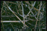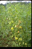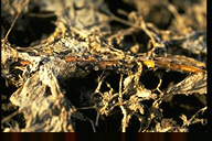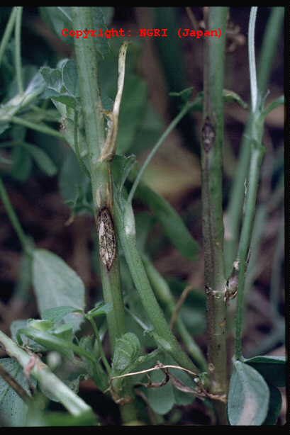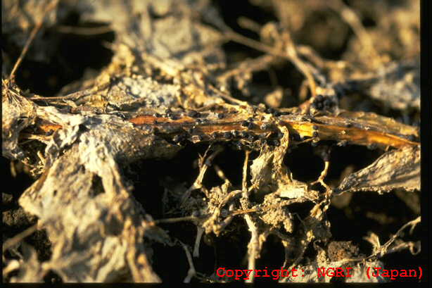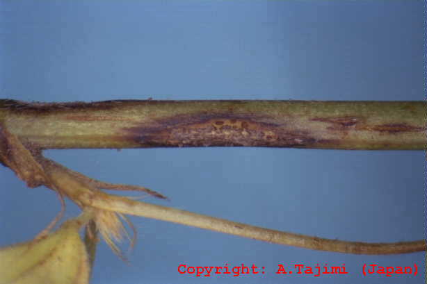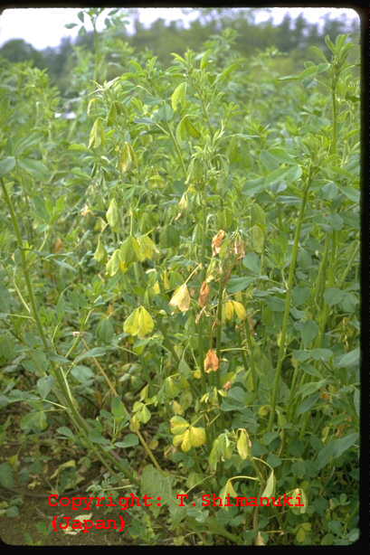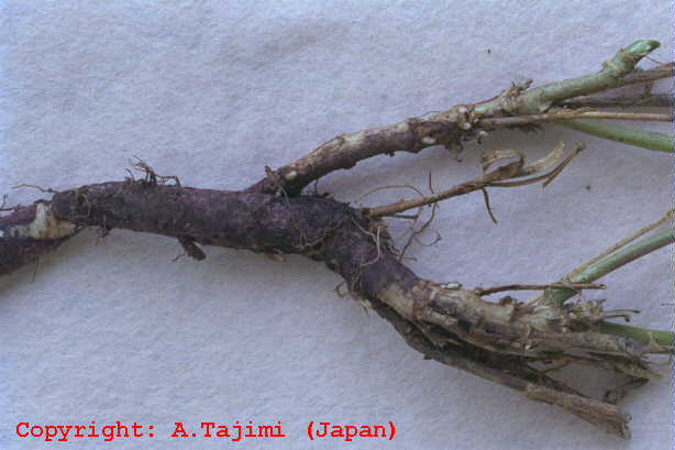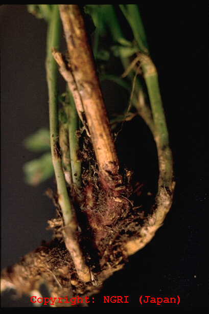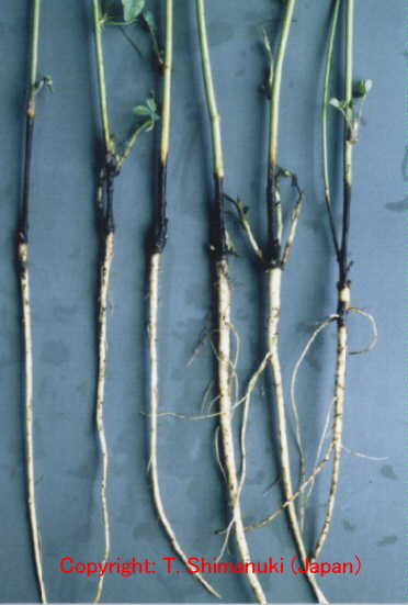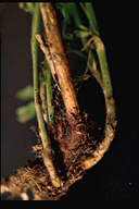 株枯を引き起こす糸状菌病。地際部から上方数センチにわたり、茎を黒褐色の病斑が取り巻く。病斑表面はゴツゴツした感じで、わずかに陥没している。多くの病斑は皮層部にとどまり、根にはほとんど異常が認められなかった。病斑部には赤褐色の微小菌核が形成され、やがて地上部全体が黄化する。病原菌は多犯性で、クローバ類、トレフォイル、インゲンマメ、ダイズ、アズキにも病原性を示す。 |