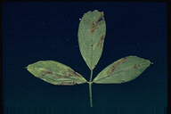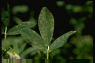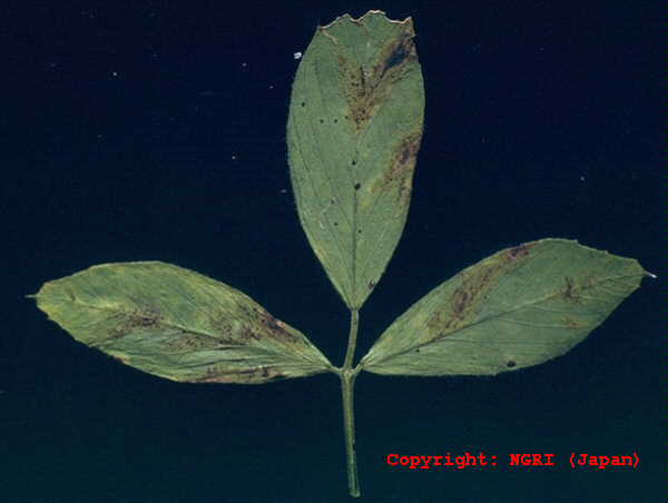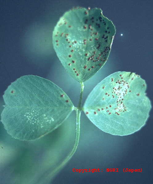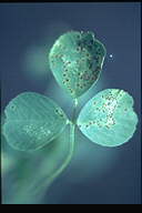 夏から秋に発生する、暖地で被害の大きい糸状菌病。葉、葉柄、茎に発生し、黄褐色、紡錘形、少しくぼみ、中央部に黒いかび(剛毛)を生じた病斑となる。病斑部から上は萎れてしまうことが多く、激発時には株枯となる。病原菌はクローバにも寄生する。 |