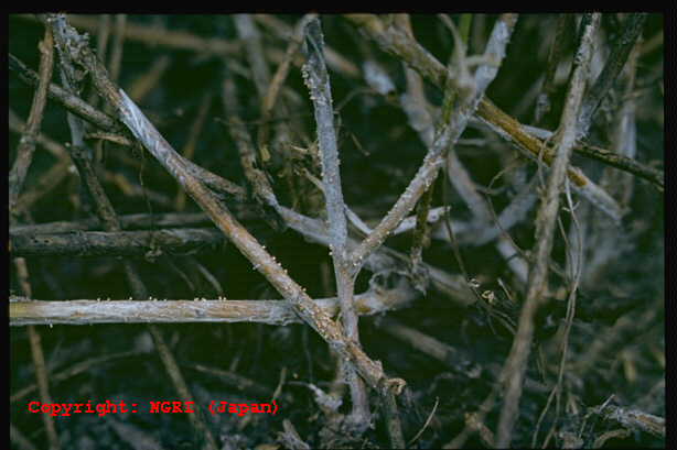 株枯れを引き起こし、主に北海道で発生する重要病害。病徴は融雪直後から現れ、茎葉は水浸状になり、ゆでたように軟化して、乾くと灰褐色に変色する。この上には暗褐色~黒色、球形~不整形、直径0.5-1mm程度の菌核を多数形成する。マメ科牧草には生物型Aが寄生するとされる。発病すると春の萌芽の遅れ、1番草の生育遅延・減収、2-3番草の減収を引き起こす。 |