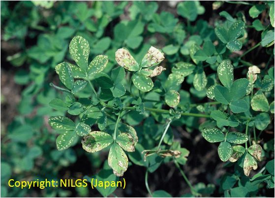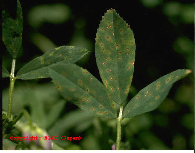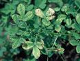 アルファルファで最も一般的な生理障害。多雨条件で多発することが多い。初め下葉に白色の小斑点が現れ、これが徐々に上葉にも広がる。症状が進むと、斑点の周縁部が黄化し、黒褐色の壊疽斑となる。激発すれば株絶え、越冬不良、草勢の衰退を引き起こし、草地のマメ科率の低下を招く。この症状の予防、回復にはこまめな土壌診断と適切な施肥が必要である。 |