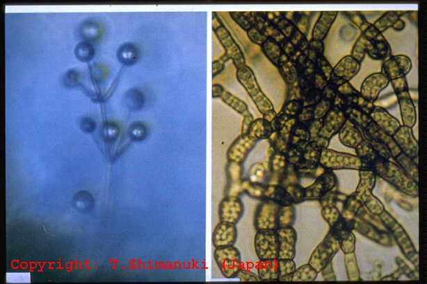 葉に発生する斑点性の糸状菌病。初め葉が何となく色あせ、徐々に不定形、大きさ5mm程度の黄斑になっていく。中央部には黒粒点が現れ、やがて病斑は褐色になり、互いに融合して、葉全体がまくれ上がるように枯れていく。 |