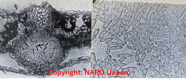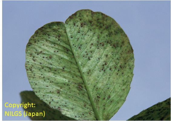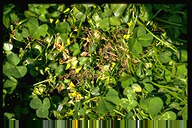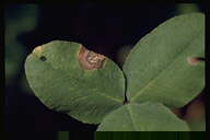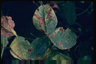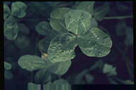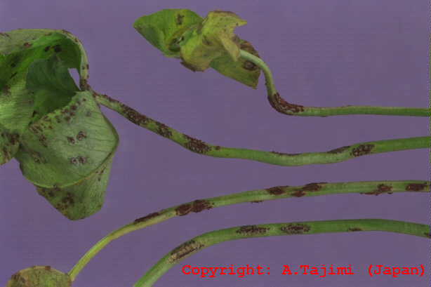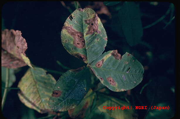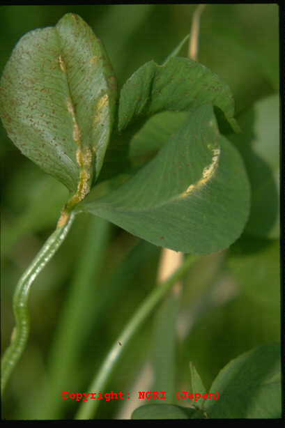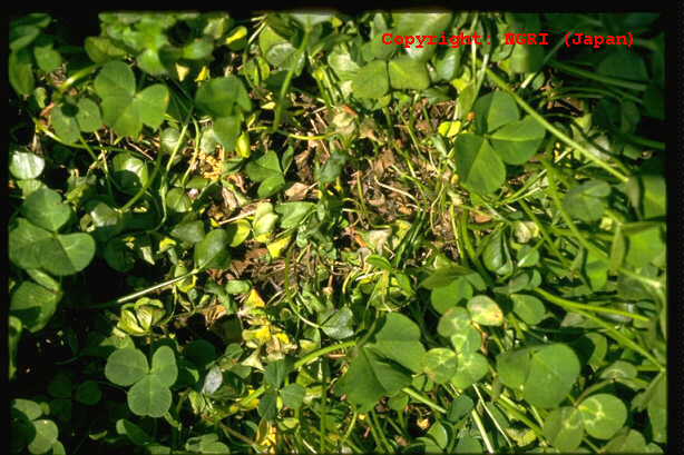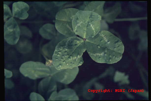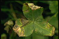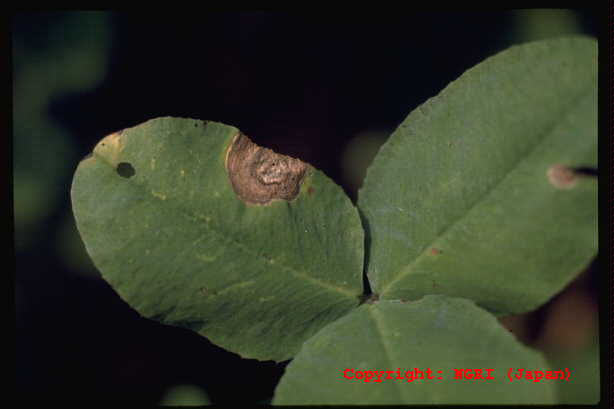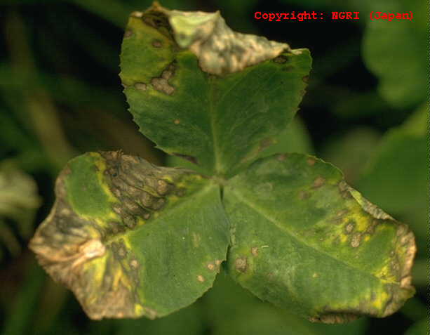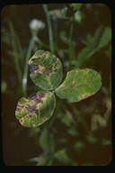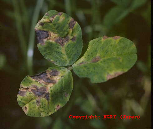 主に葉と葉柄に発生する斑点性の糸状菌病。葉では葉脈に仕切られた灰褐色の病斑となり、互いに融合して葉を枯らす。葉柄に発生すると紫褐色の条斑となり、被害はさらに大きくなる。病原菌は他のクローバ類も侵すが、寄生性は若干分化しているとされる。 |