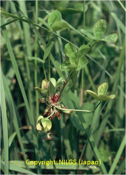 頭花を葉化させるファイトプラズマ病。関東地方で1970年代に確認された。病徴は、軽症の場合は花梗や萼が異常に伸長するだけだが、重症化すると萼が葉状となり、頭花から大きく伸長する。伸長した葉は徐々に葉縁から黄変または赤変し、早期に枯死する。アカクローバおよびアルサイククローバにも発生する。葉化の出現は気温25℃以上で促進されるが、これは植物体内に感染するPLOの増殖速度と関係するとされる。 |