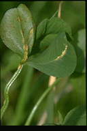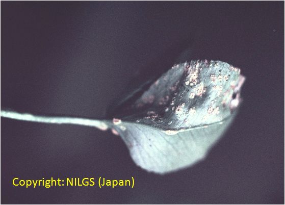 葉柄および葉に発生するさび病。シロクローバ上では冬胞子堆のみを形成する。冬胞子堆は主に葉柄と葉の裏に形成され、濃褐色、楕円形で、かなり大きく隆起する。多発すると葉はまくれ上がるように枯れる。 |