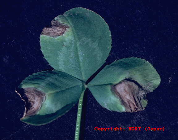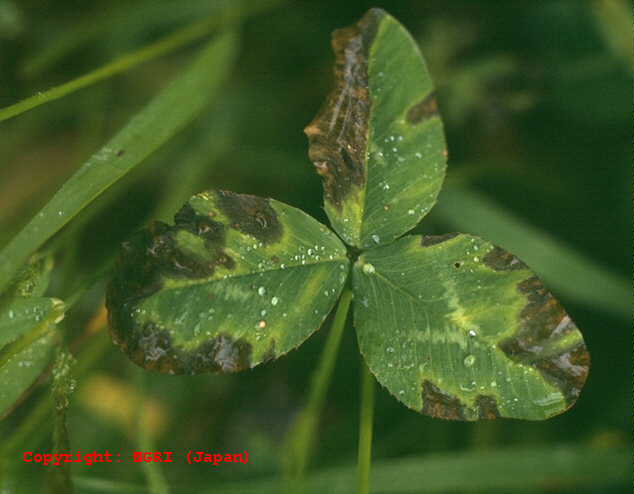 冷涼地で発生する葉枯性の糸状菌病。病斑は葉縁から形成され、黒褐色、V字形となり、周囲は黄化する。病斑表面には黒粒点(子のう殻)が形成され、ここから溢泌する子のう胞子が風雨で飛散してまん延する。病原菌は他のクローバ類を侵すが、寄生性は分化している。 |