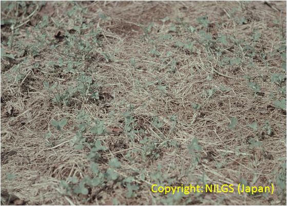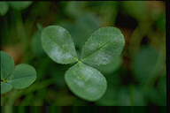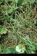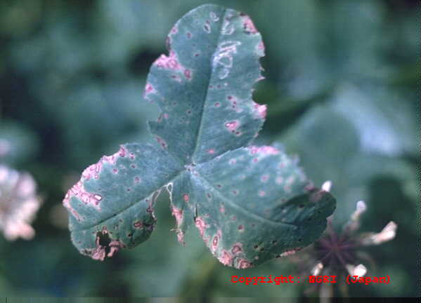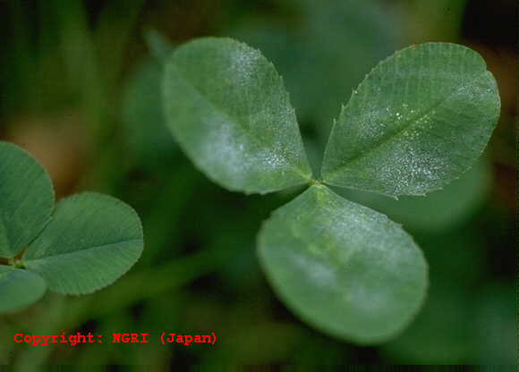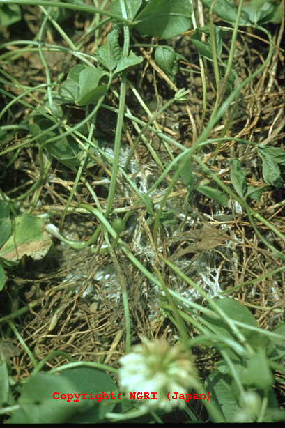 葉が白い粉を吹いたようになる糸状菌病。春先から葉の表面に初めはあまり目立たない、白い粉を撒いたような薄い菌叢を形成するが、菌叢は徐々に厚くなり、葉全体が覆われ枯死する。冷涼乾燥条件で多発し、曇天が続くなど日照が足りないと被害が大きくなる。被害はアカクローバほどではない。病原菌はアカクローバ、アルサイククローバ、ベッチなど広い範囲のマメ科牧草に寄生する。 |