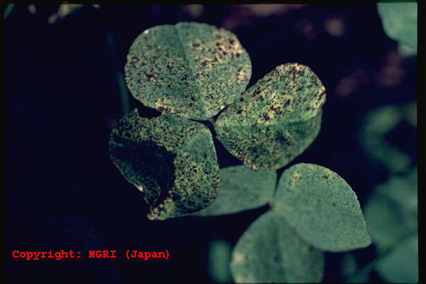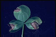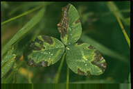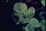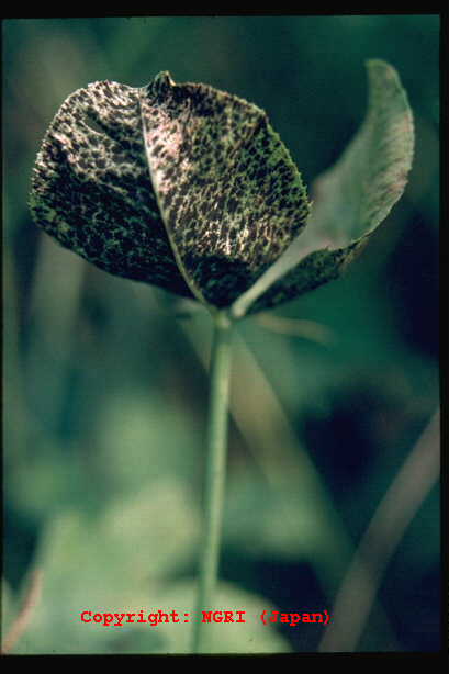 冷涼地で発生する葉枯性の糸状菌病。葉の裏側に黒いすす状のかびを生じる。黒い不定形の小病斑が密生するような状態で、葉は初めは緑色を保つが、徐々に黄化する。他のクローバ類でも発生する。 |