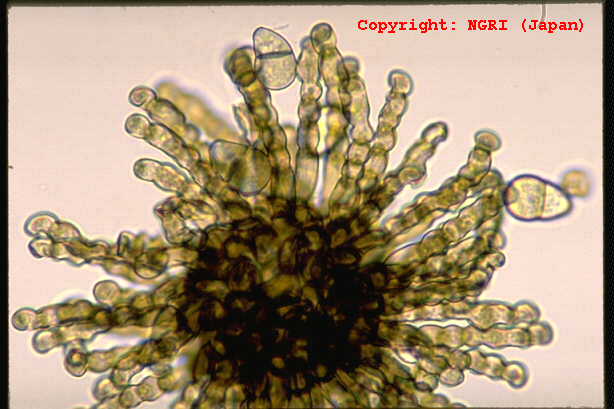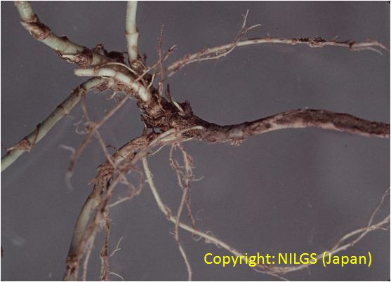 暖地での代表的な株枯性の糸状菌病。梅雨明け後、温度が上がってくると発生しはじめ、白い綿糸のような菌糸がみっしりと茎の基部や冠根部に絡みつく。罹病組織は徐々に褐変、崩壊していき、やがて地上部全体が枯死し、株枯に至る。また、枯れた葉や茎の上で菌糸が束状になり、その上に初め白色のちに黄褐色となる菌糸の塊が形成される。これは菌核で、土中で越冬して翌年の伝染源となる。罹病組織の残さ、菌核、菌糸の断片が風雨で飛散して伝搬する。病原菌は菌核病菌よりもさらに多犯性である。