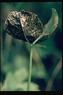 冷涼地での発生が多い斑点性の糸状菌病。主に葉に黒褐色、直径1mm程度の小斑を多数形成し、葉全体に黒胡椒を振りかけたような感じになる。病斑周囲は次第に黄化し、ついには葉が枯れ上がる。冷涼多雨時には激発する。古くなった病斑上には黒い小粒(子のう殻)が形成される。病原菌はアルファルファのそばかす病菌とは別種である。 |
