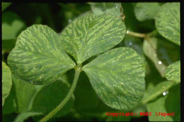 代表的なウイルス病。自然状態では利用2ー3年目からはほとんどの株が罹病する。病徴は春から現れるが、植物の種類や環境条件によって、黄斑モザイク、緑斑モザイク、退緑斑点、縮葉など様々な病徴となる。ウイルスはアブラムシにより伝播されるが、その種類も様々である。病原ウイルスは3種が報告されているが、主なものはAMV、BYMVである。病徴によりウイルスの種類が大体判別できる。 |