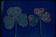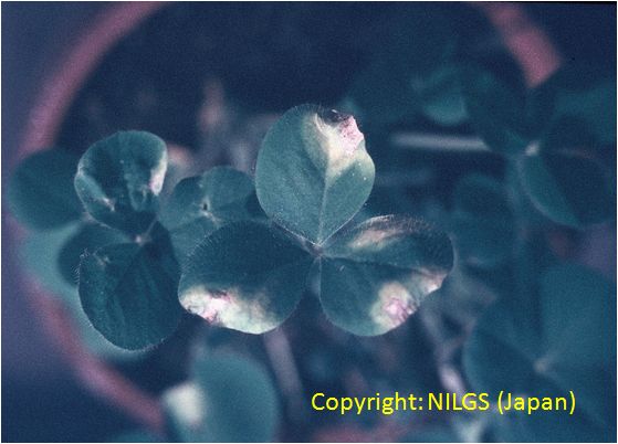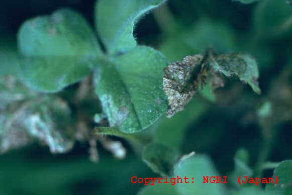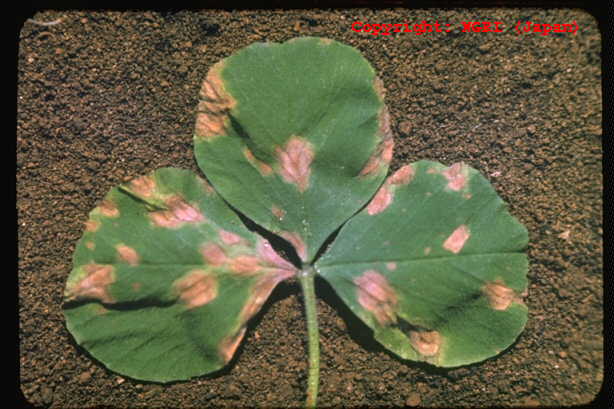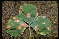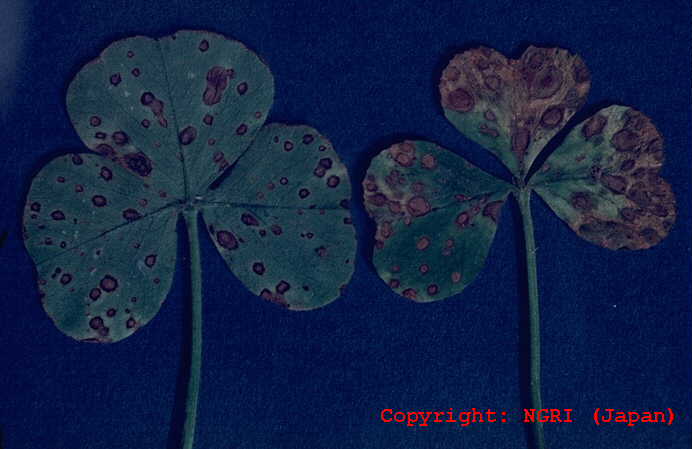 主に葉と葉柄に発生する斑点性の糸状菌病。葉では葉脈に仕切られた灰褐色の病斑となり、互いに融合して葉を枯らす。葉柄に発生すると紫褐色の条斑となり、被害はさらに大きくなる。病原菌は他のクローバ類も侵すが、寄生性は若干分化しているとされる。 |