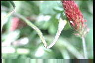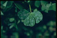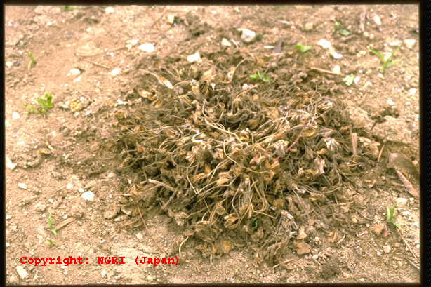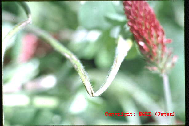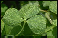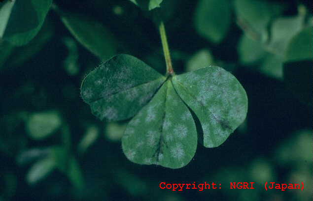 葉が白い粉を吹いたようになる糸状菌病。春先から葉の表面に初めはあまり目立たない、白い粉を撒いたような薄い菌叢を形成するが、菌叢は徐々に厚くなり、葉全体が覆われ枯死する。冷涼乾燥条件で多発し、曇天が続くなど日照が足りないと被害が大きくなる。被害はアカクローバほどではない。病原菌は他のマメ科作物にも寄生する。 |