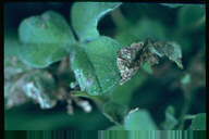 地上部全体に発生する糸状菌病。葉では黒褐色、不定形の病斑となり、即座に互いに融合しては全体を覆う大型病斑となる。病斑中心部には黒い毛羽だった菌核が形成される。激発すると、黒い菌糸が株全体に伸長し、株枯を引き起こす。病原菌は山羊の流涎症の原因となるスラフラミンというアルカロイドを産生する。 |