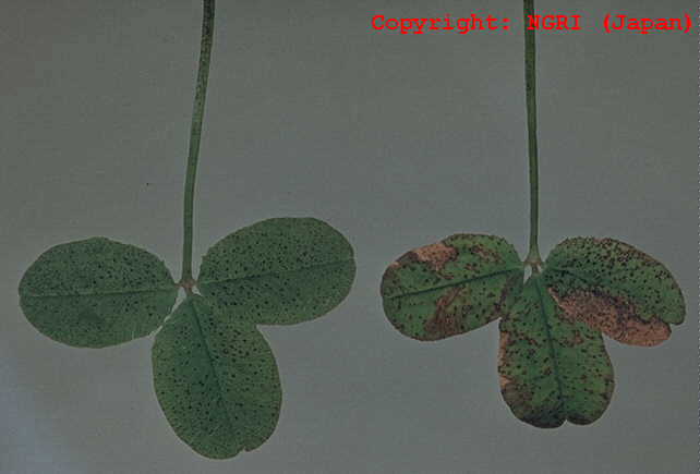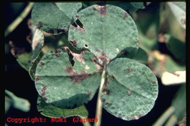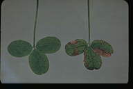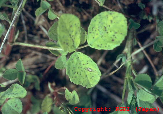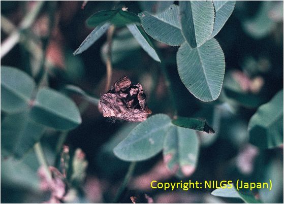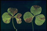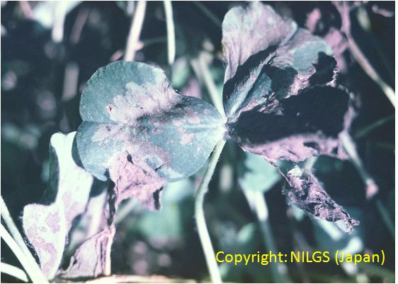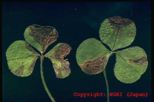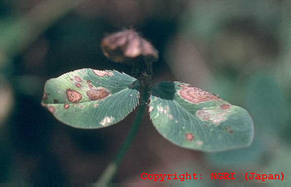 主に葉と葉柄に発生する斑点性の糸状菌病。葉では葉脈に仕切られた灰褐色の病斑となり、互いに融合して葉を枯らす。葉柄に発生すると紫褐色の条斑となり、被害はさらに大きくなる。病原菌は他のクローバ類も侵すが、寄生性は若干分化しているとされる。 |