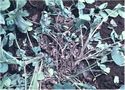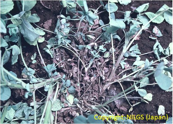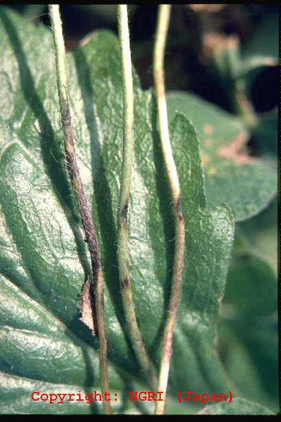 地上部全体に発生する糸状菌病。葉では黒褐色、不定形の病斑となり、即座に互いに融合しては全体を覆う大型病斑となる。病斑中心部には黒い毛羽だった菌核が形成される。激発すると、黒い菌糸が株全体に伸長し、株枯を引き起こす。病原菌は山羊の流涎症の原因となるスラフラミンというアルカロイドを産生する。 |