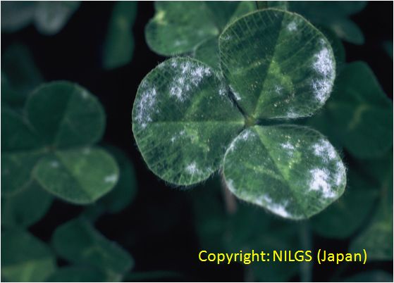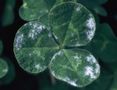 葉が白い粉を吹いたようになる糸状菌病。春先から葉の表面に初めはあまり目立たない、白い粉を撒いたような薄い菌叢を形成するが、菌叢は徐々に厚くなり、葉全体が覆われ枯死する。冷涼乾燥条件で多発し、曇天が続くなど日照が足りないと被害が大きくなる。アカクローバと同様に被害が大きい。病原菌は他のマメ科作物にも寄生する。 |