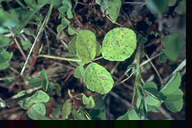 夏から秋に発生する、暖地で被害の大きい糸状菌病。葉、葉柄、茎に発生し、黄褐色、紡錘形、少しくぼみ、中央部に黒いかび(剛毛)を生じた病斑となる。病斑部から上は萎れてしまうことが多く、激発時には株枯となる。病原菌はアルファルファにも寄生する。 |