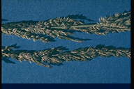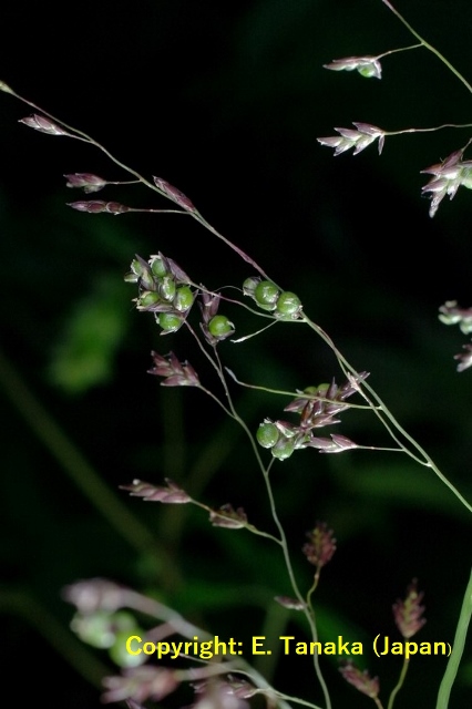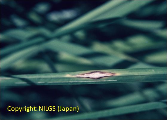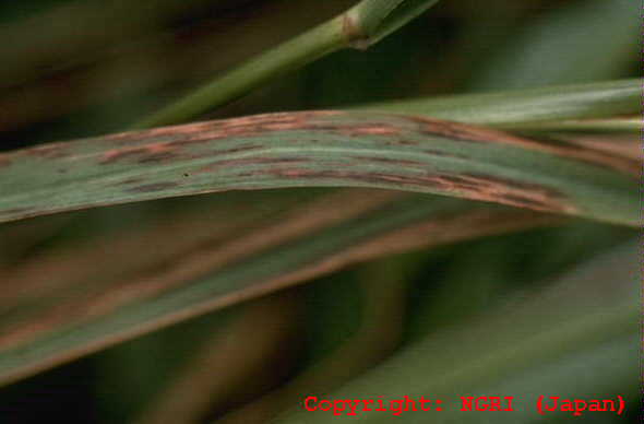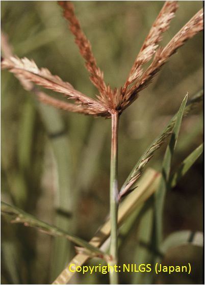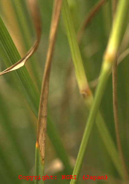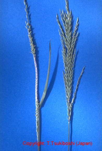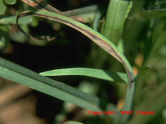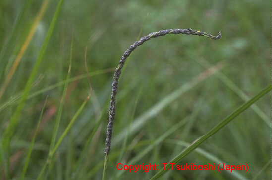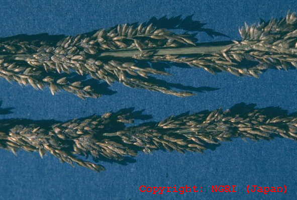 暖地で発生の多い穂枯性の糸状菌病。出穂後、穂が灰色から黒色の菌叢に覆われ、枝梗が互いに接着された状態となり、穂全体がかびる。葉には白色の菌叢が葉脈に沿って条状に現れる。病原菌はエンドファイトとして植物全体に感染し、感染植物は耐虫性を持つようになることが報告されている。 |